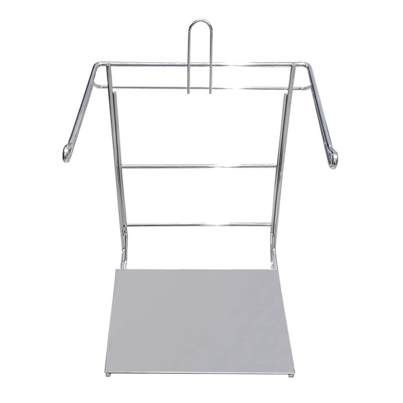 Our bag holder is made out of metal and comes in a chrome finish. Includes a heavy duty & sturdy base with mirror chrome finish.
