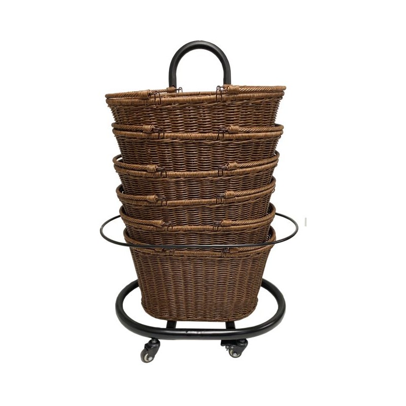 Powder-coated frame, with lockable wheels, holding 6 oval polywicker baskets with handles