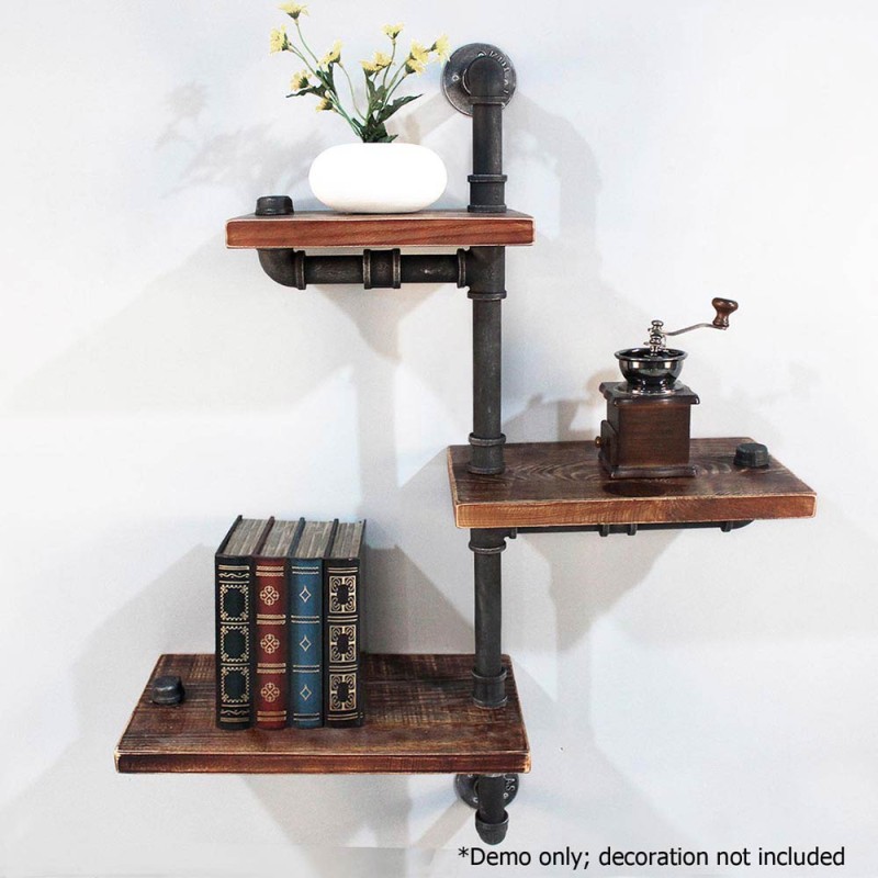 Featuring a set of urban rustic floating pipe shelf that is perfect for homes, offices and cafe interiors. Made from quality metal pipe and solid timber, this unique pipe shelf is designed to fit any space including wall corners. Direction of each shelf can be adjusted before or after being hung.