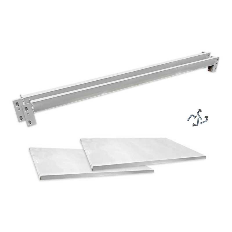 Package includes: 2x beams, 1x shelf(2 parts), 4x sefety pins