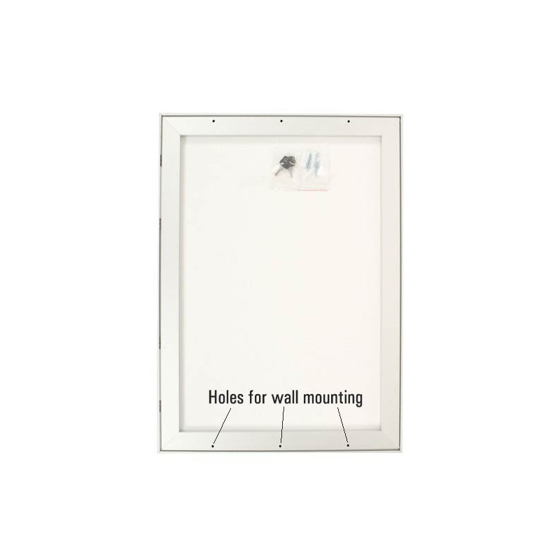 The frame has a hinged door and is lockable for security. The construction is a durable aluminium with a protective, high impact, polycarbonate cover.